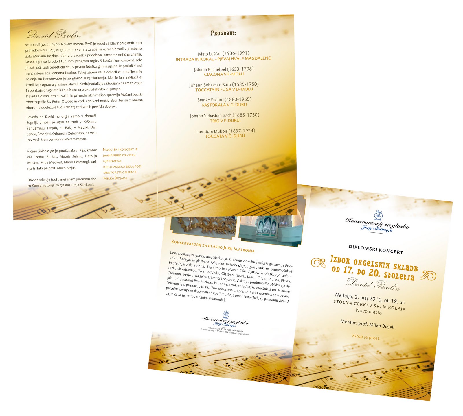Oblikovali smo privlačno in z glasbo navdahnjeno brošuro za diplomski koncert, ki je vse ljubitelje glasbe razveselil v stolni cerkvi sv. Nikolaja v Novem mestu. Tudi v grafičnem dizajnu smo v ospredje izpostavili prelivanje glasbenih tonov in barvnih odtenkov.